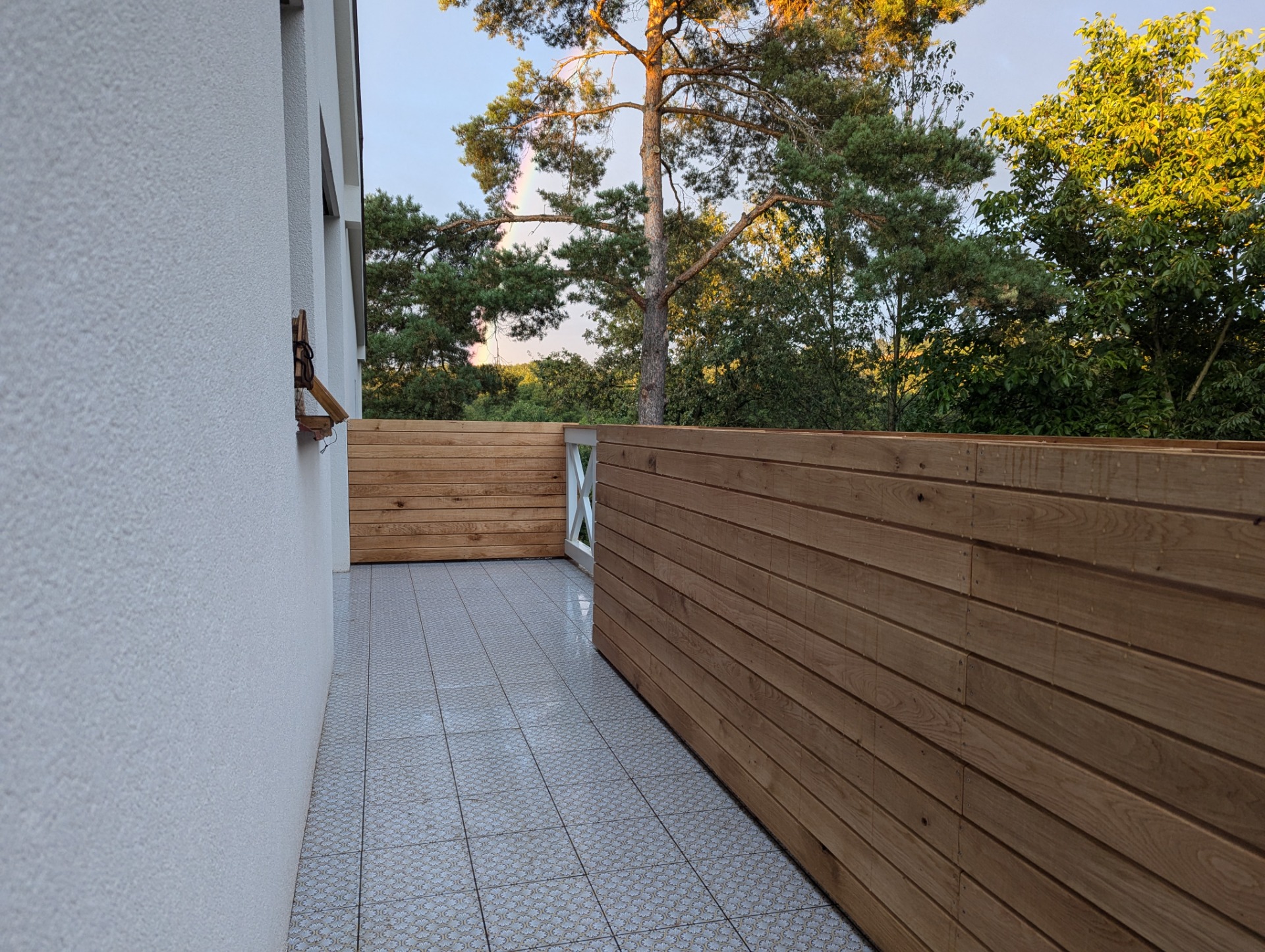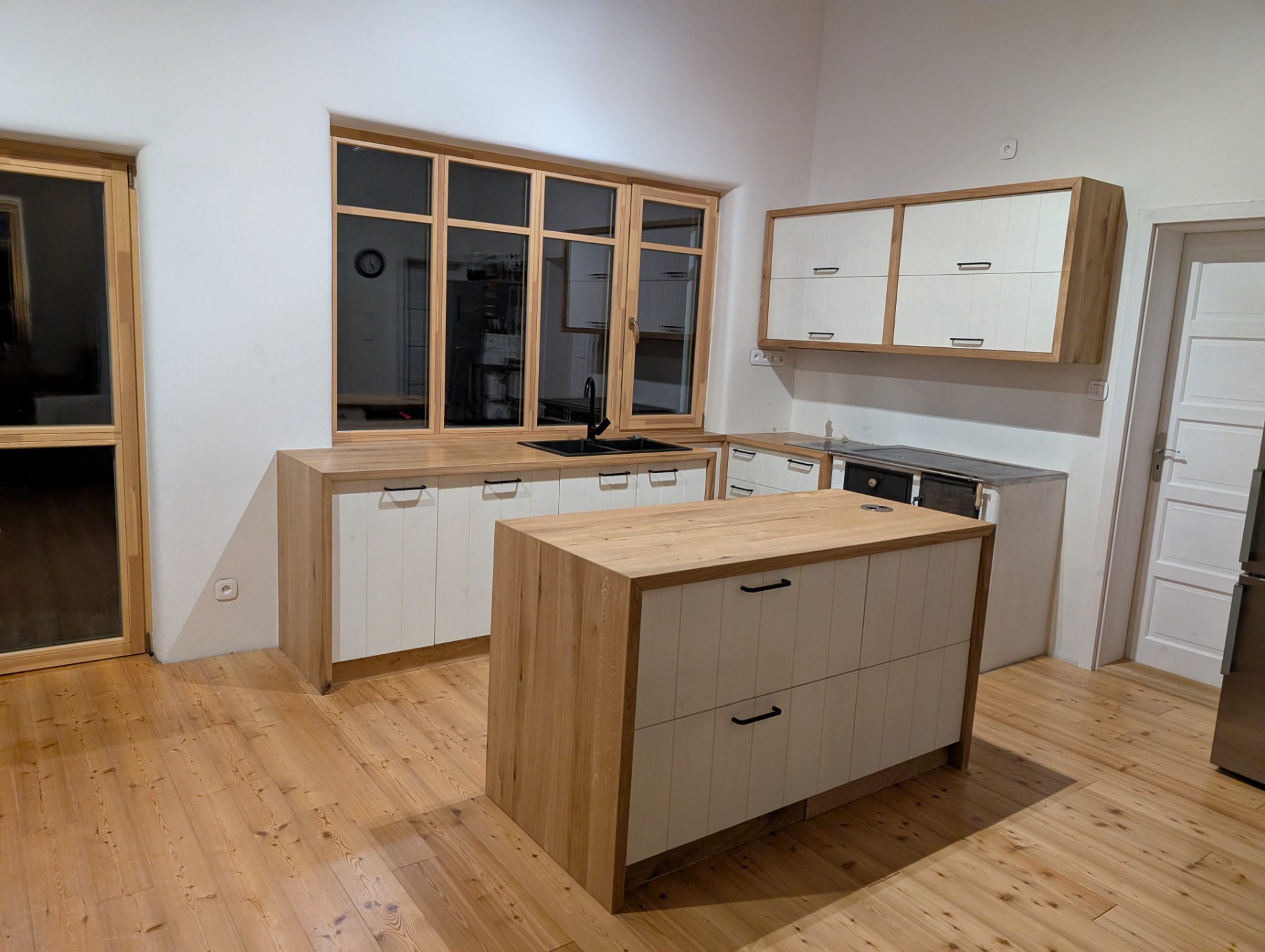 Kuchyně na míru, kterou charakterizuje výrazná dubová pracovní deska. Ta je specifická tím, že zabíhá i k oknu a vytváří tak zároveň parapet. A také tím, že pokračuje i na bocích kuchyně a tím ji olemuje.