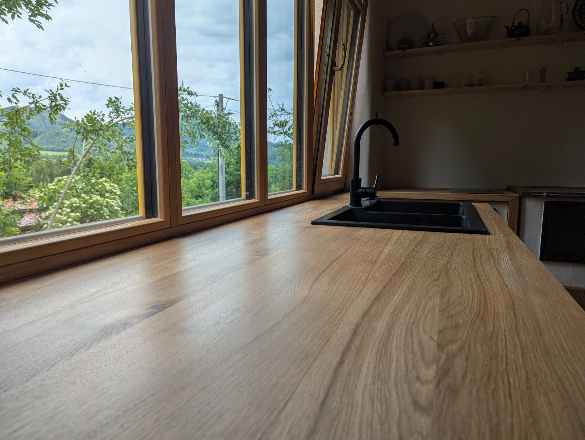 Oslovila mě mladá rodina z Beskyd. Měli představu o kuchyni s netypickým designem, která bude navazovat na velké okno. Pracovní deska zároveň vytvoří parapet okna.