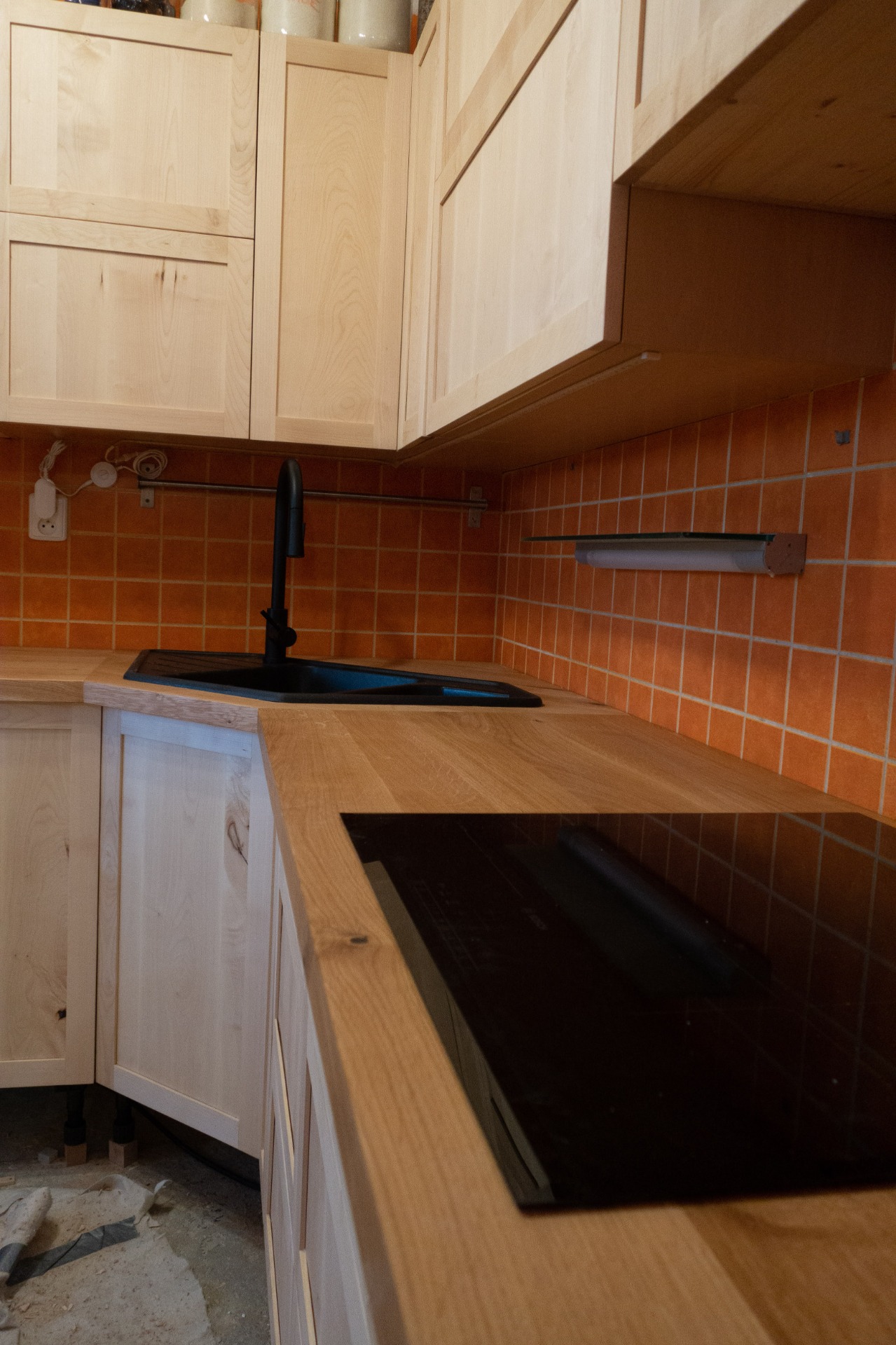 Moji rodiče tak chtěli zanechat z kuchyně co šlo, ale všechno pohledové udělat znovu. A zainvestovat do lepšího materiálu, aby kuchyně vydržela déle. Zvolili jsme světlé javorové dřevo v kombinaci s dubovou pracovní deskou. Dub i javor jsem lepil na dílně z truhlářského řeziva. Umožnilo mi to tak pohrát si s kresbou dřeva a především u pracovní desky eliminovat kroucení dřeva. Jednotlivé laťě spárovky totiž můžu vedle sebe klást "na střídačku", aby se tendence ke kroucení vzájemně vyrušily. Nefunguje to nikdy stoprocentně, ale kroucení je výrazně menší, než když spárovku lepí náhodně velká firma.