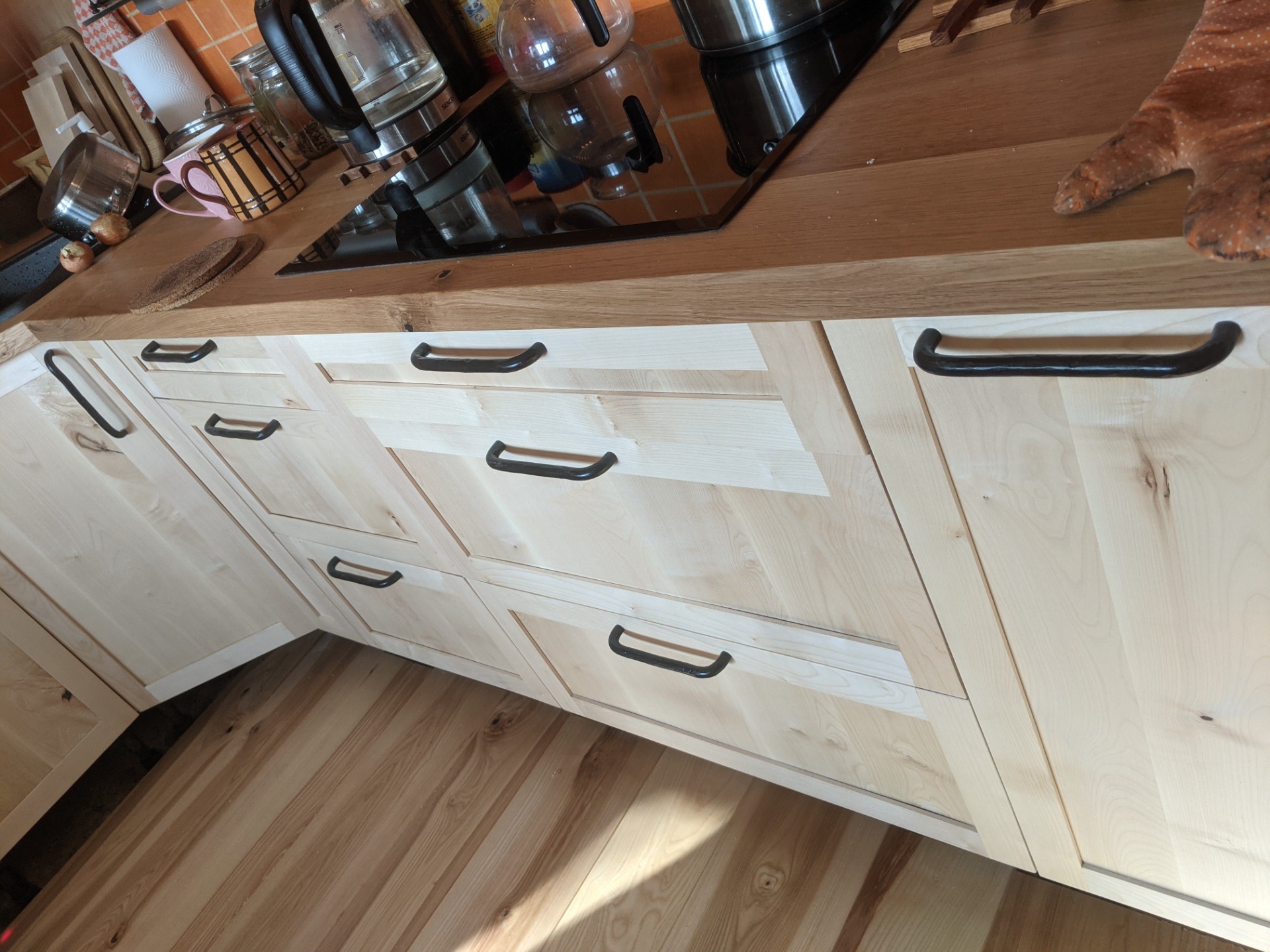Můj táta nakonec ukoval úchytky ve své malé kovárně a kuchyň je tak hotová. Už několik let funguje, ale počítáme s tím, že po 5 letech dubová pracovní deska chytne patinu. A pokud to rodičům nebude vyhovovat, desku jednoduše přebrousíme a znovu natřeme a bude vypadat jako nová.