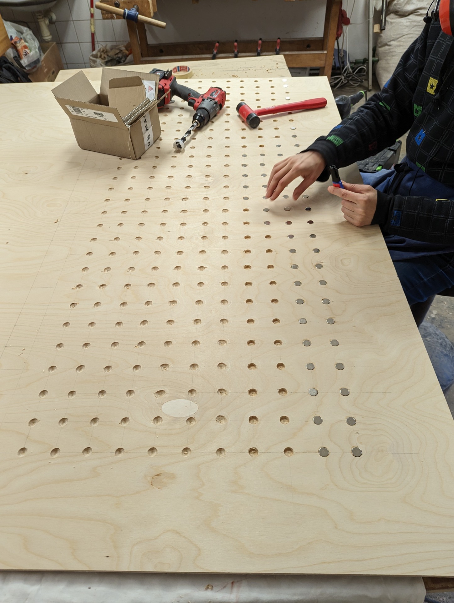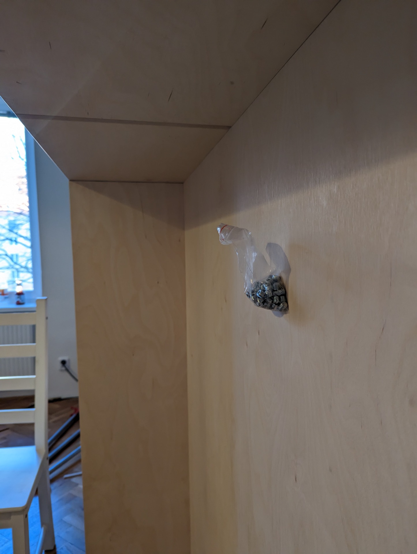 Knihovna je z březové překližky. Překližka je deska, která je složená z několika tenkých dřevěných dýh. Jde o tvrdý a masivní materiál. Tenké vrstvy dýhy navíc na hranách překližky vytváří hezký designový efekt, který jsme zde chtěli využít. Překližka má oproti levnějším materiálům výhodu, že ji lze po letech obrousit a znovu natřít. Nábytek tak třeba po 20 letech můžeme oživit, aby vypadal opět jako nový. Má to své mezery oproti nábytku z masivní spárovky, nebo biodesky. Ty lze brousit do nekonečna, zde máme jen milimetrovou dýhu, kterou nesmíme probrousit. Ale i tak je životnost takového nábytku mnohanásobná oproti laminu.