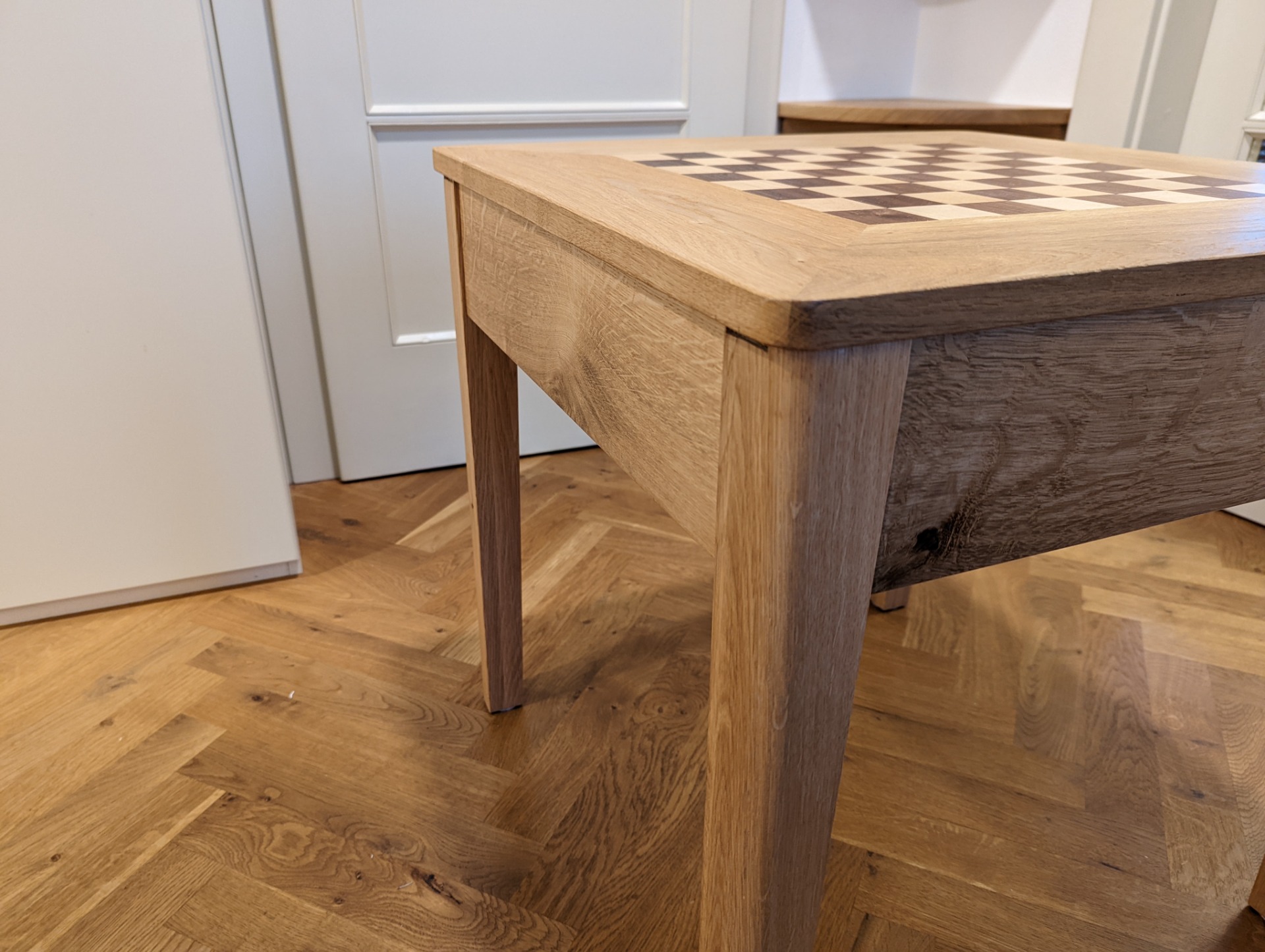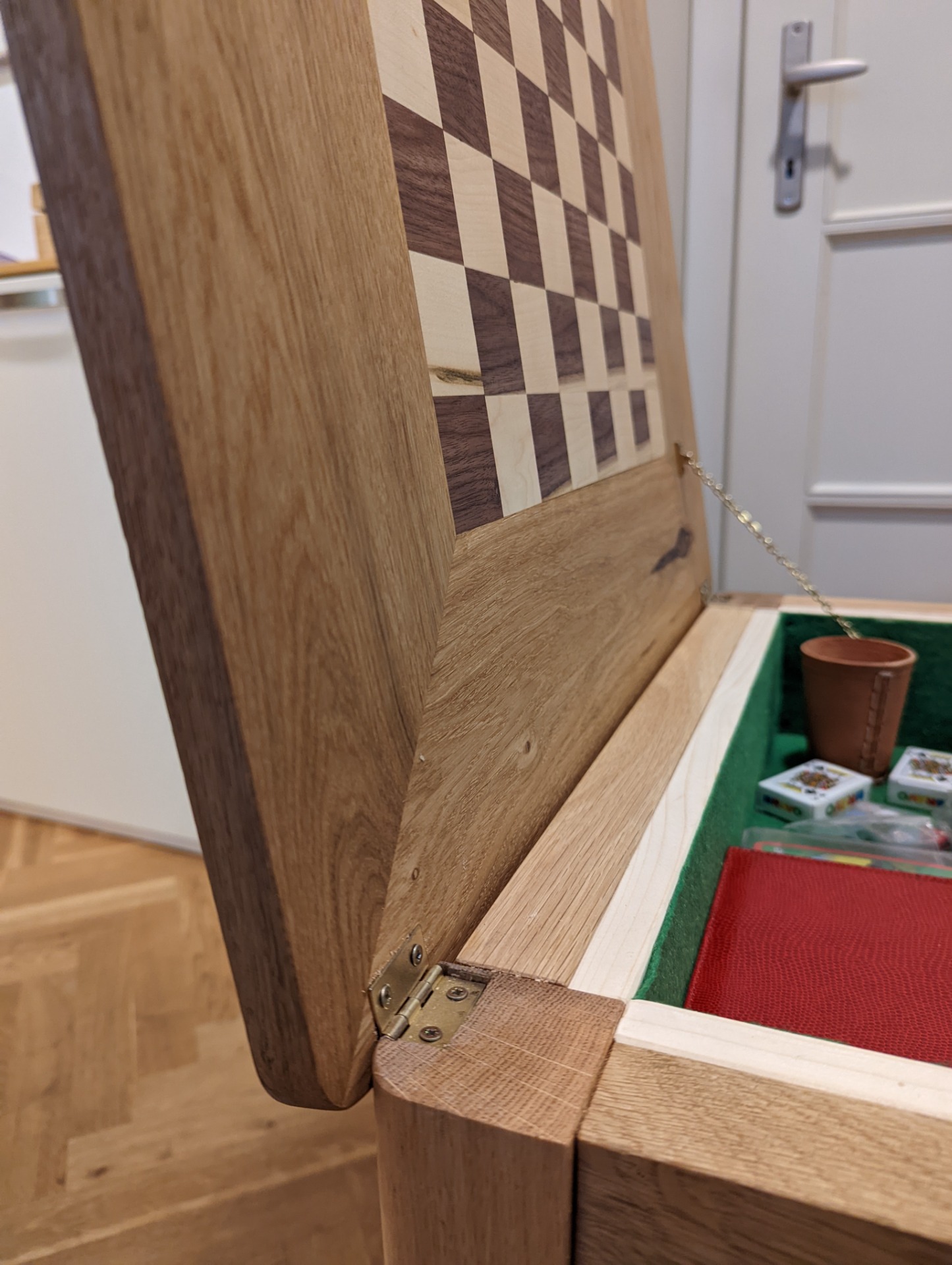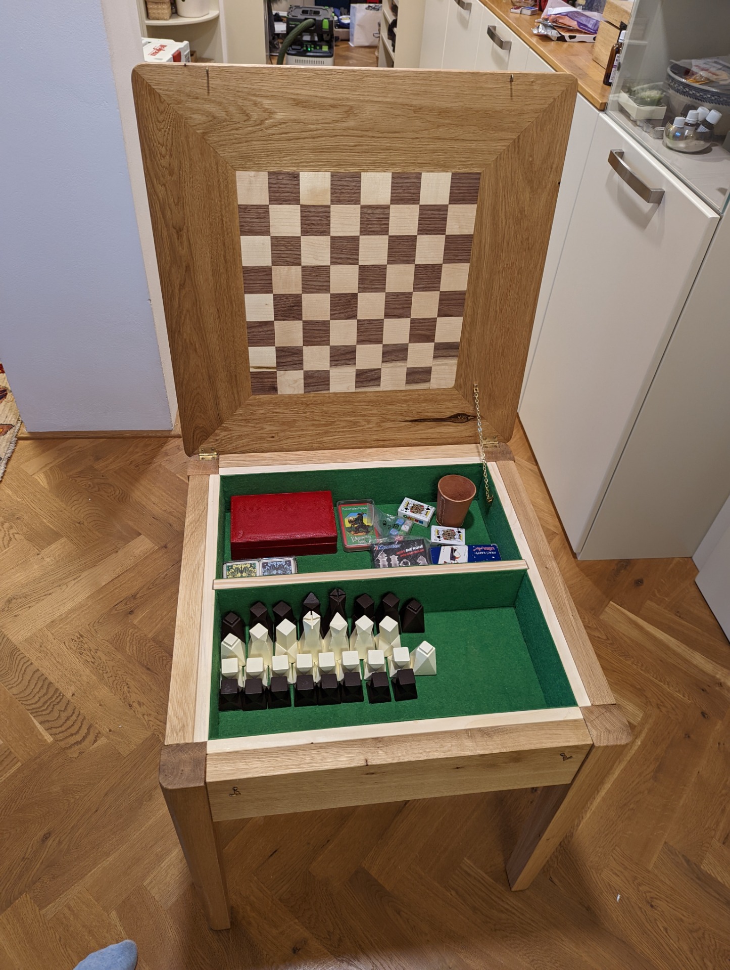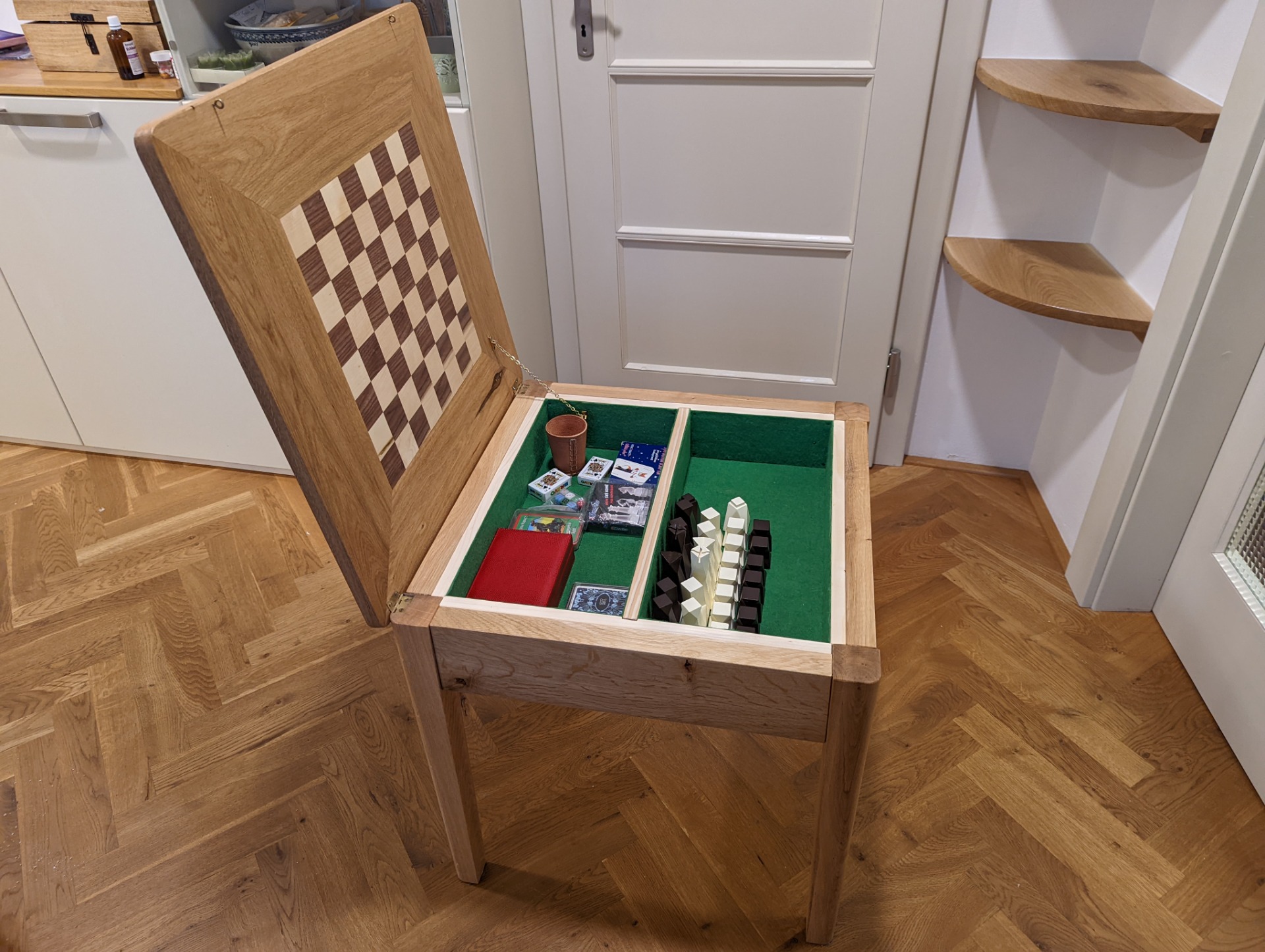 Uvnitř stolku je prostor pro uložení šachových figurek. Je možné jej vyložit filcem, nebo nechat v přírodním dřevě.