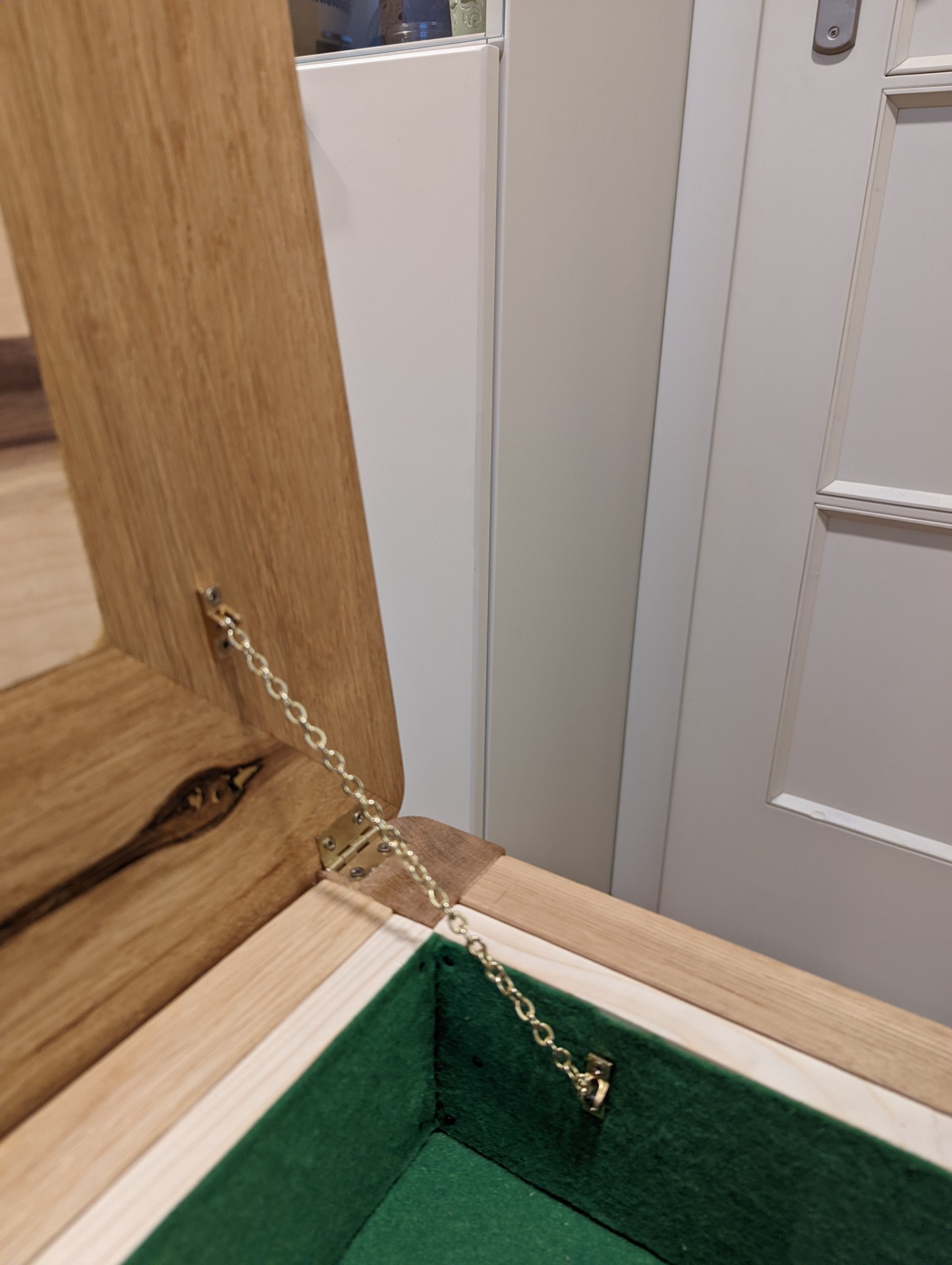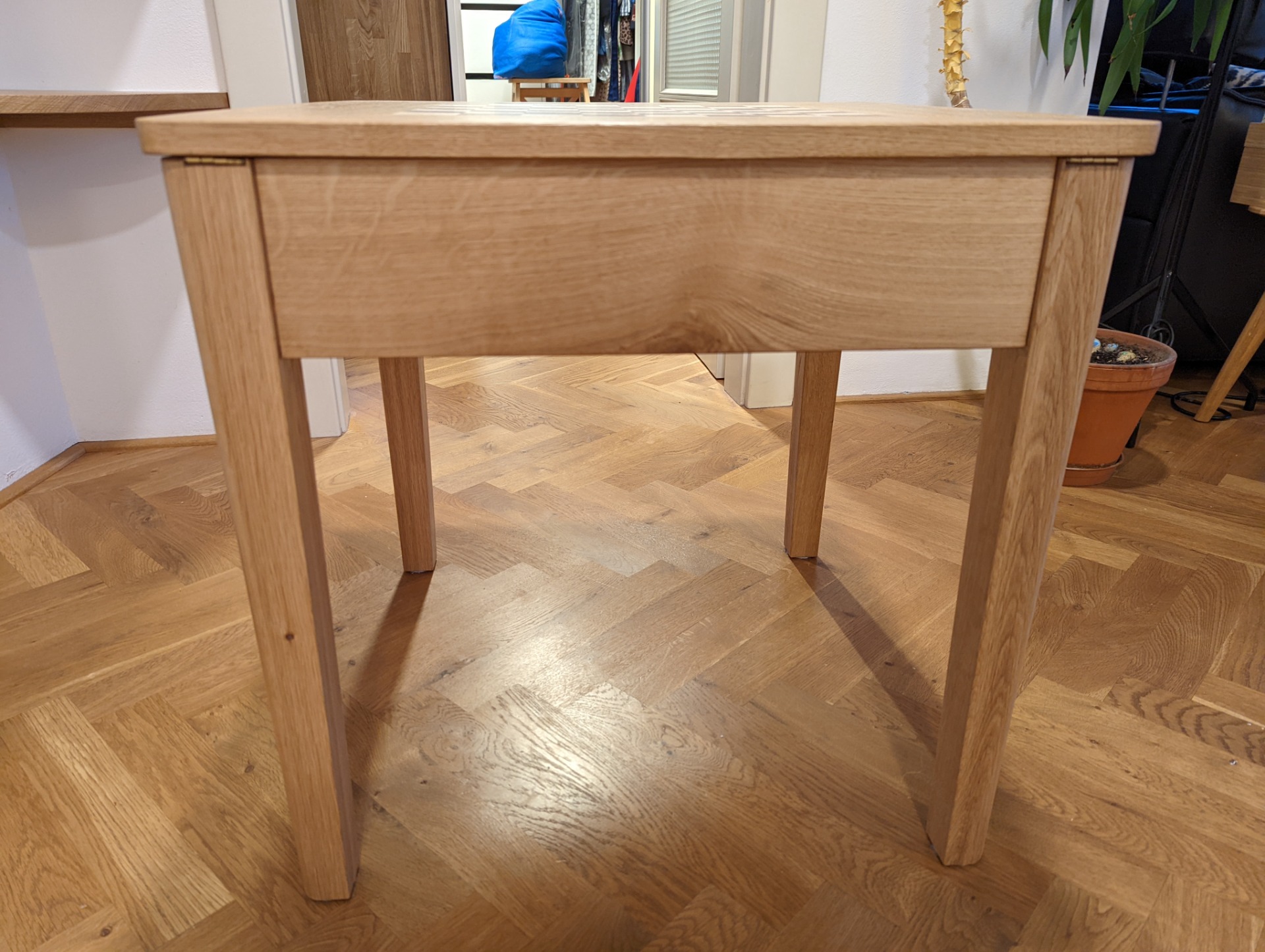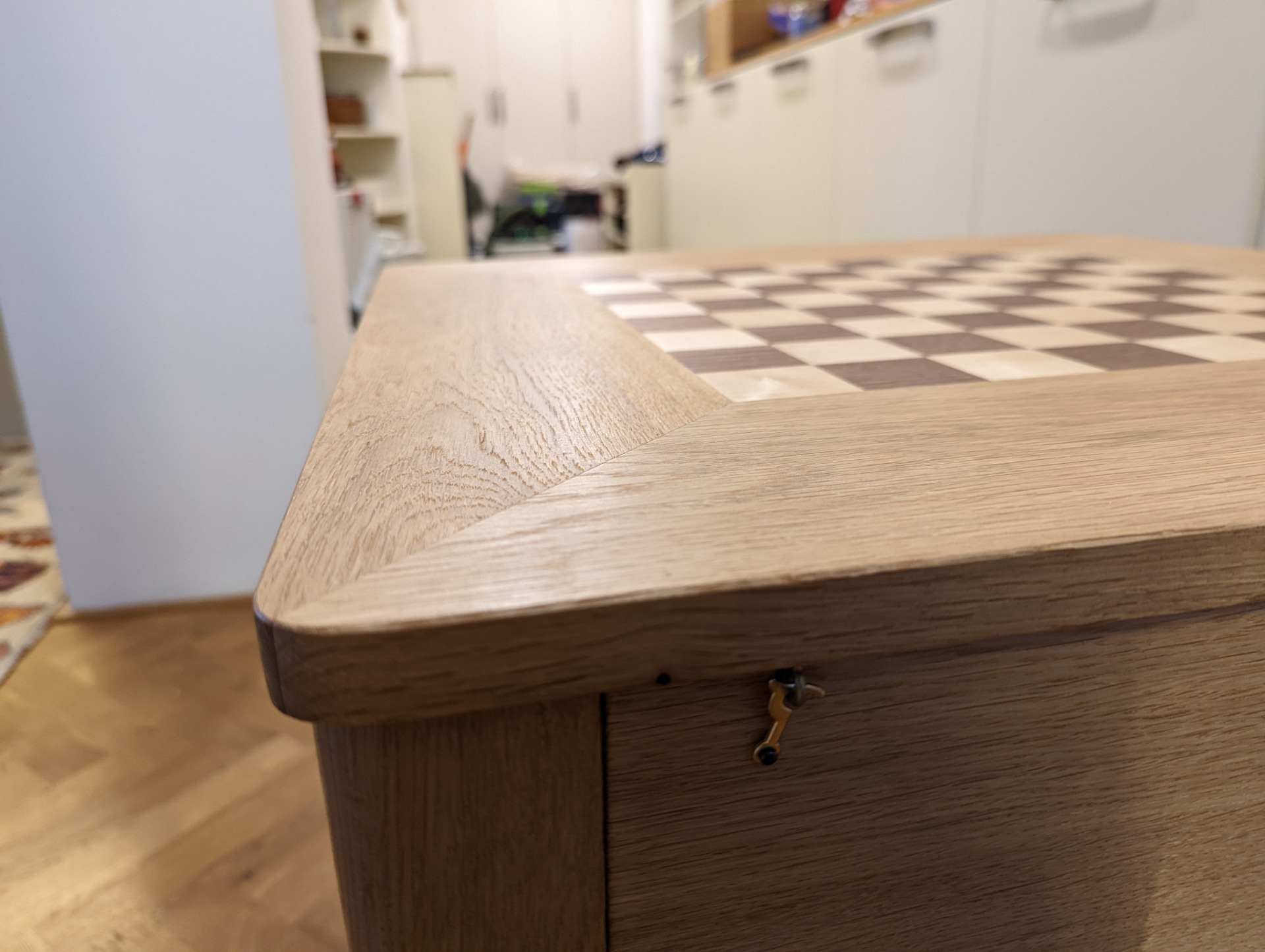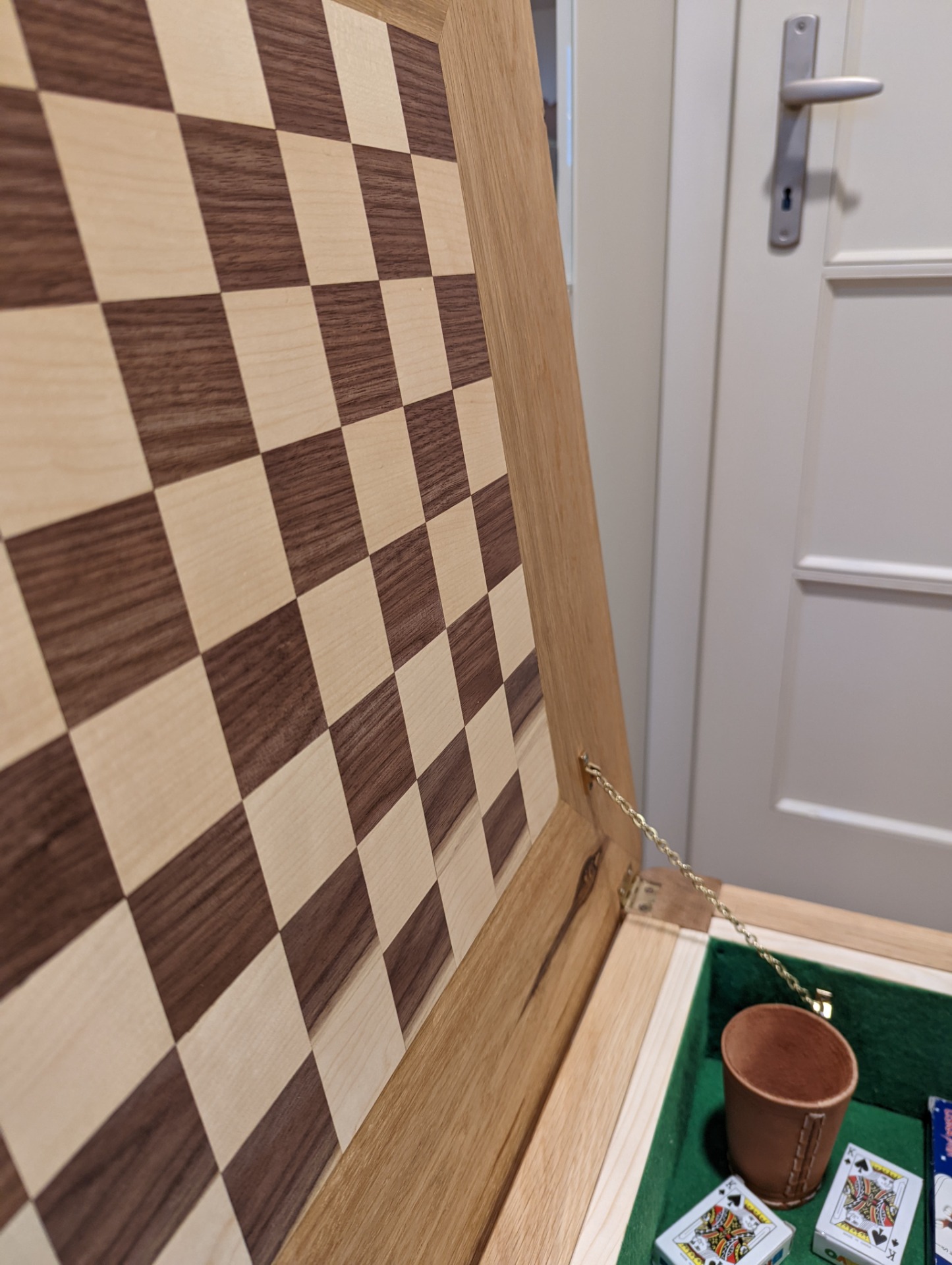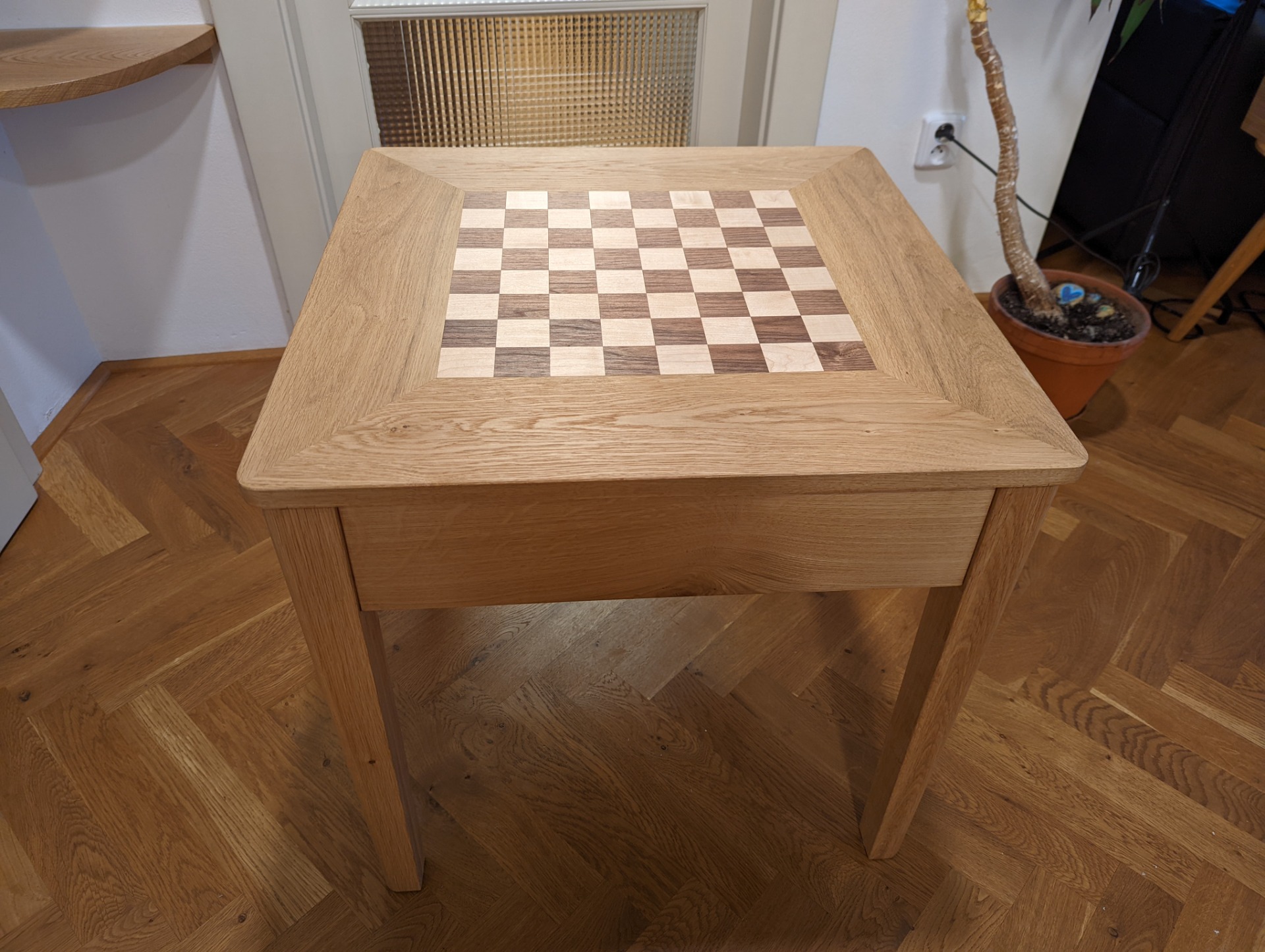 Uvnitř stolku je prostor pro uložení šachových figurek. Je možné jej vyložit filcem, nebo nechat v přírodním dřevě.