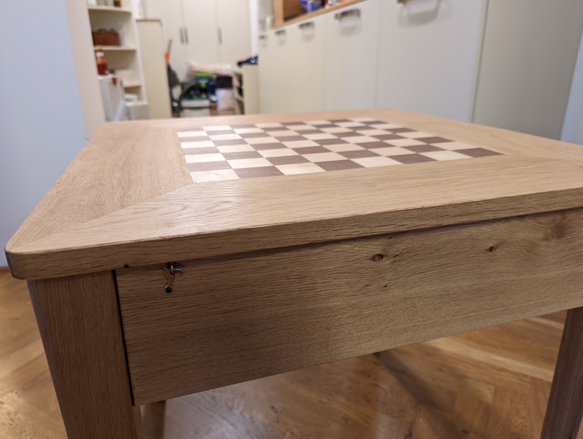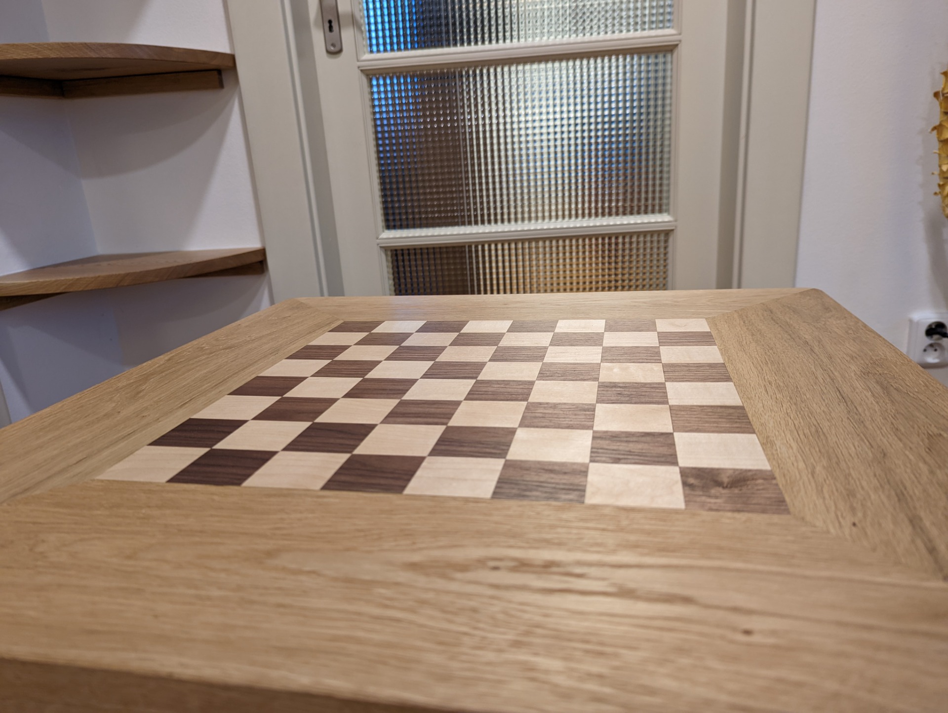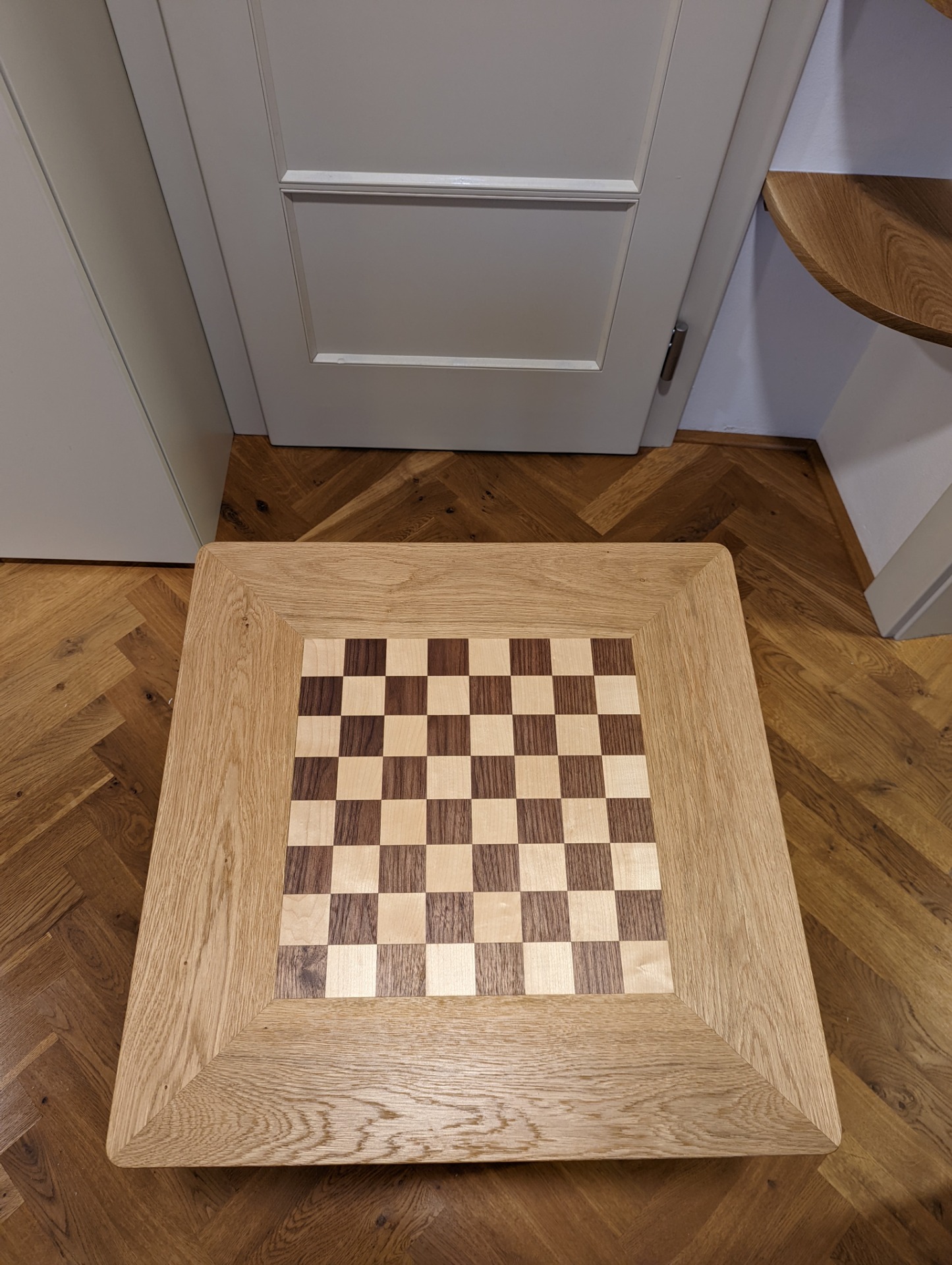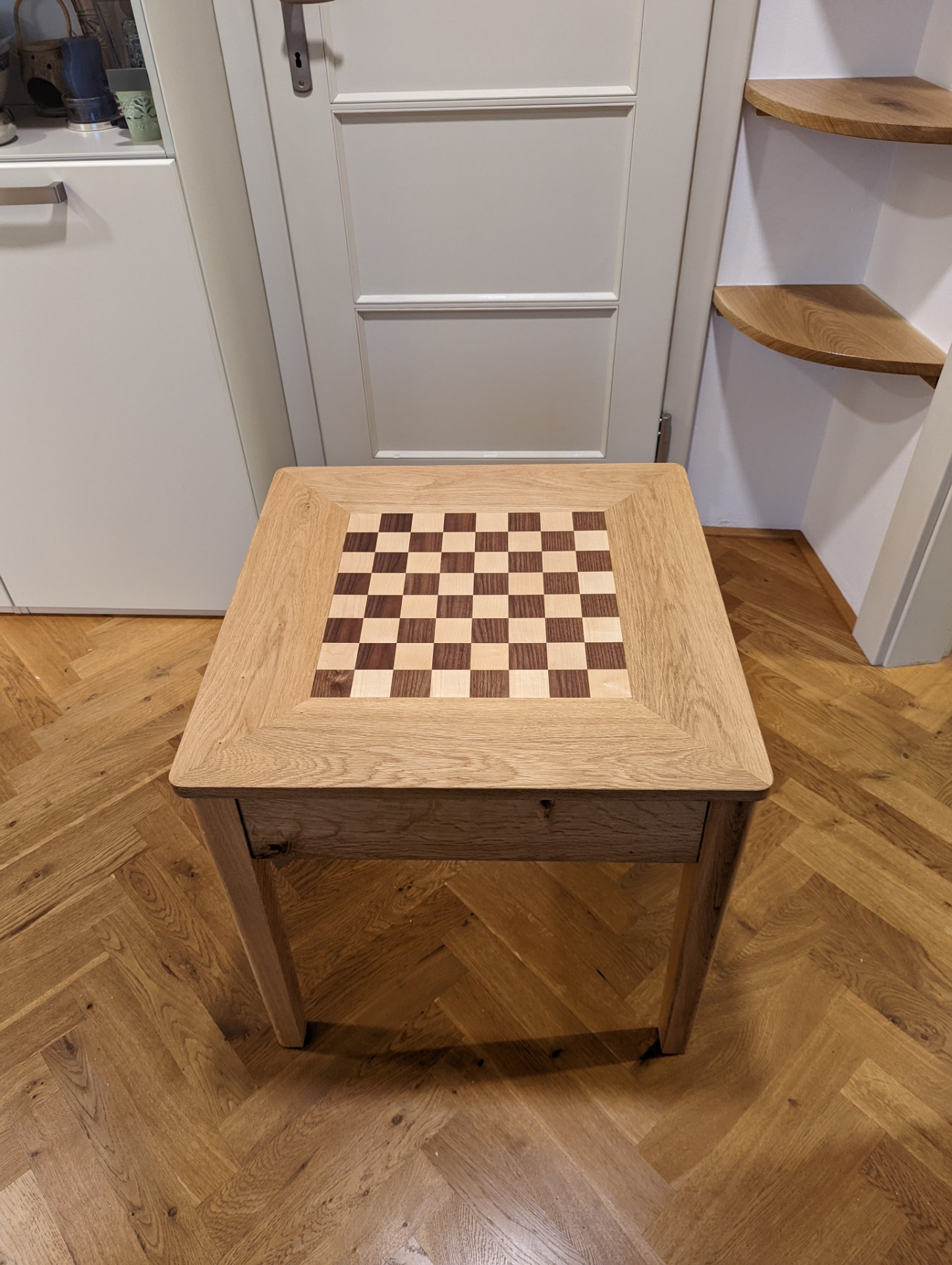 Šachový stolek je ošetřený Tvrdým voskovým olejem od firmy OSMO. Jedná se o přírodní nátěr, který si ale zachovává velkou odolnost. Při nanesení více vrstev (vždy natírám minimálně dvěma vrstvami) ho používám i na kuchyňské linky, nebo jídelní stoly. A i na těchto velmi zatížených plochách nátěr obstojí.