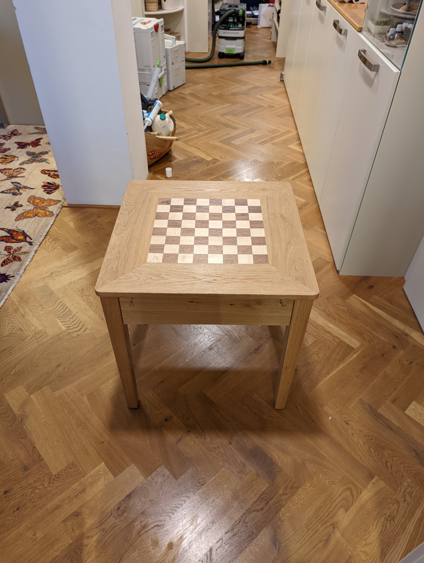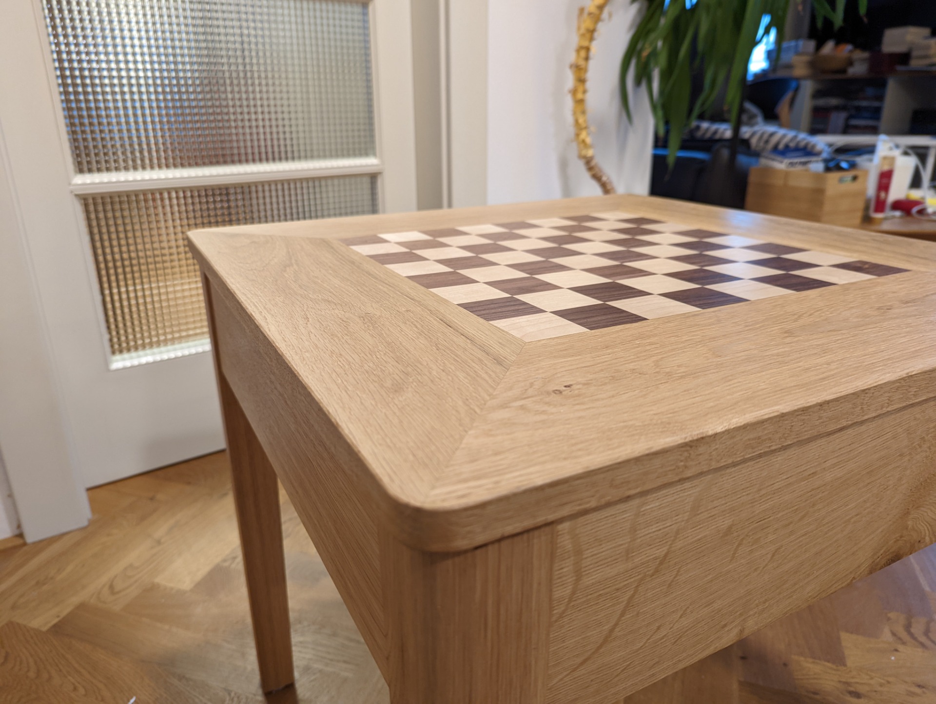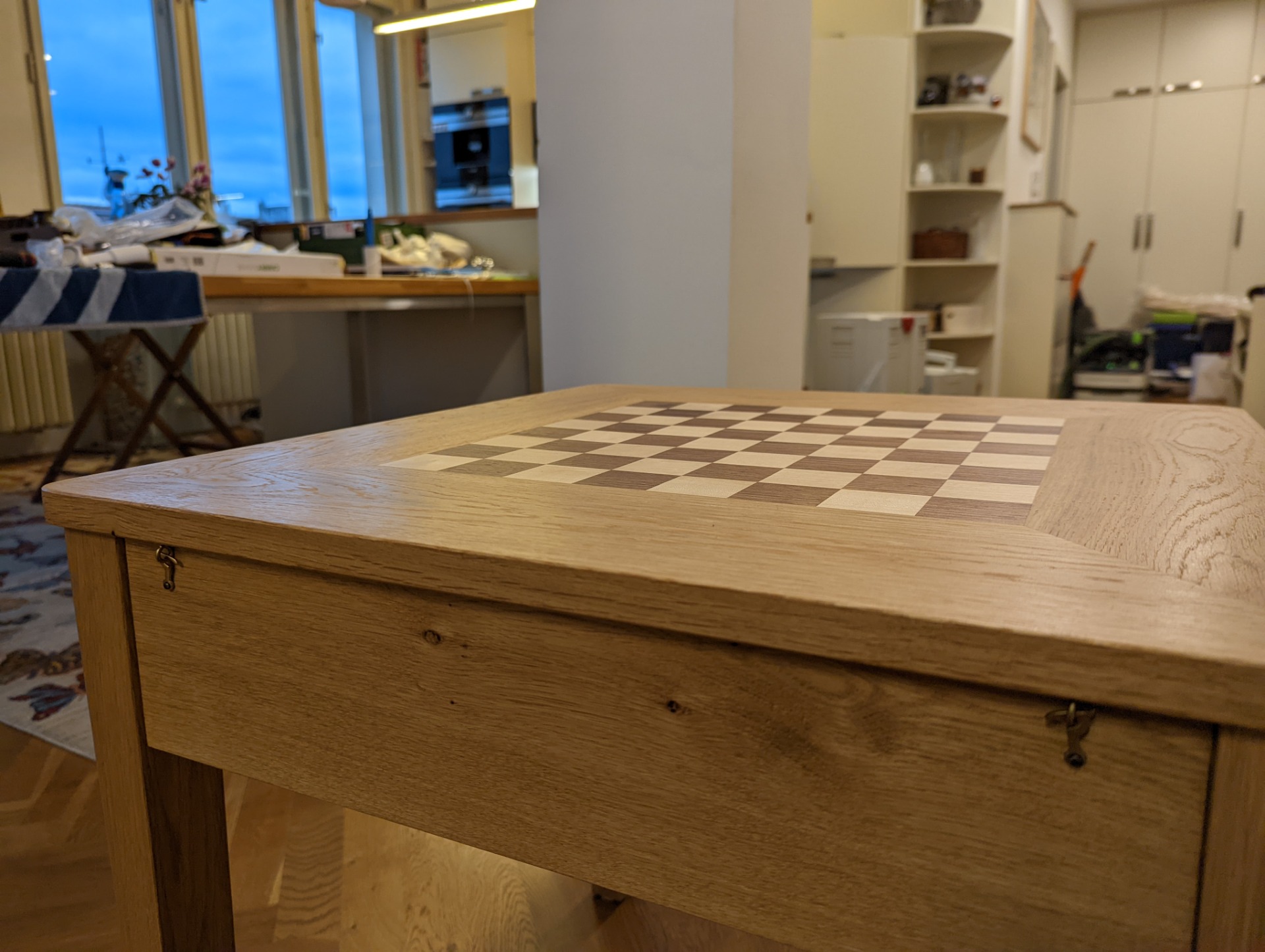 Šachový stolek je ošetřený Tvrdým voskovým olejem od firmy OSMO. Jedná se o přírodní nátěr, který si ale zachovává velkou odolnost. Při nanesení více vrstev (vždy natírám minimálně dvěma vrstvami) ho používám i na kuchyňské linky, nebo jídelní stoly. A i na těchto velmi zatížených plochách nátěr obstojí.