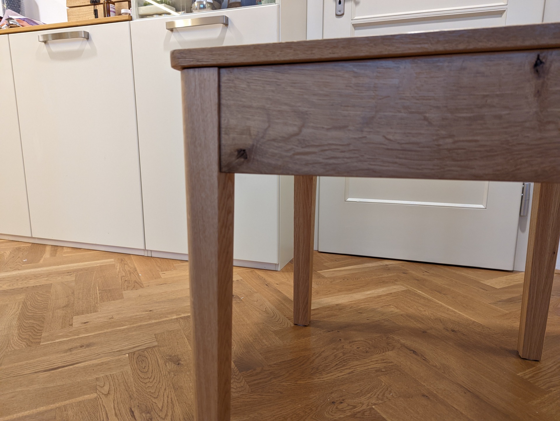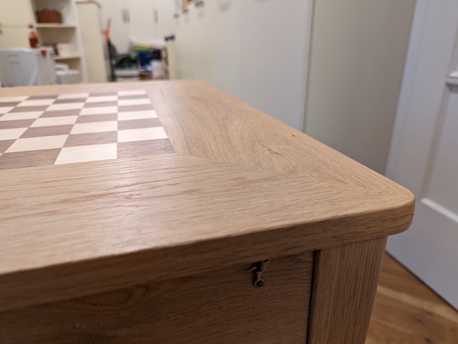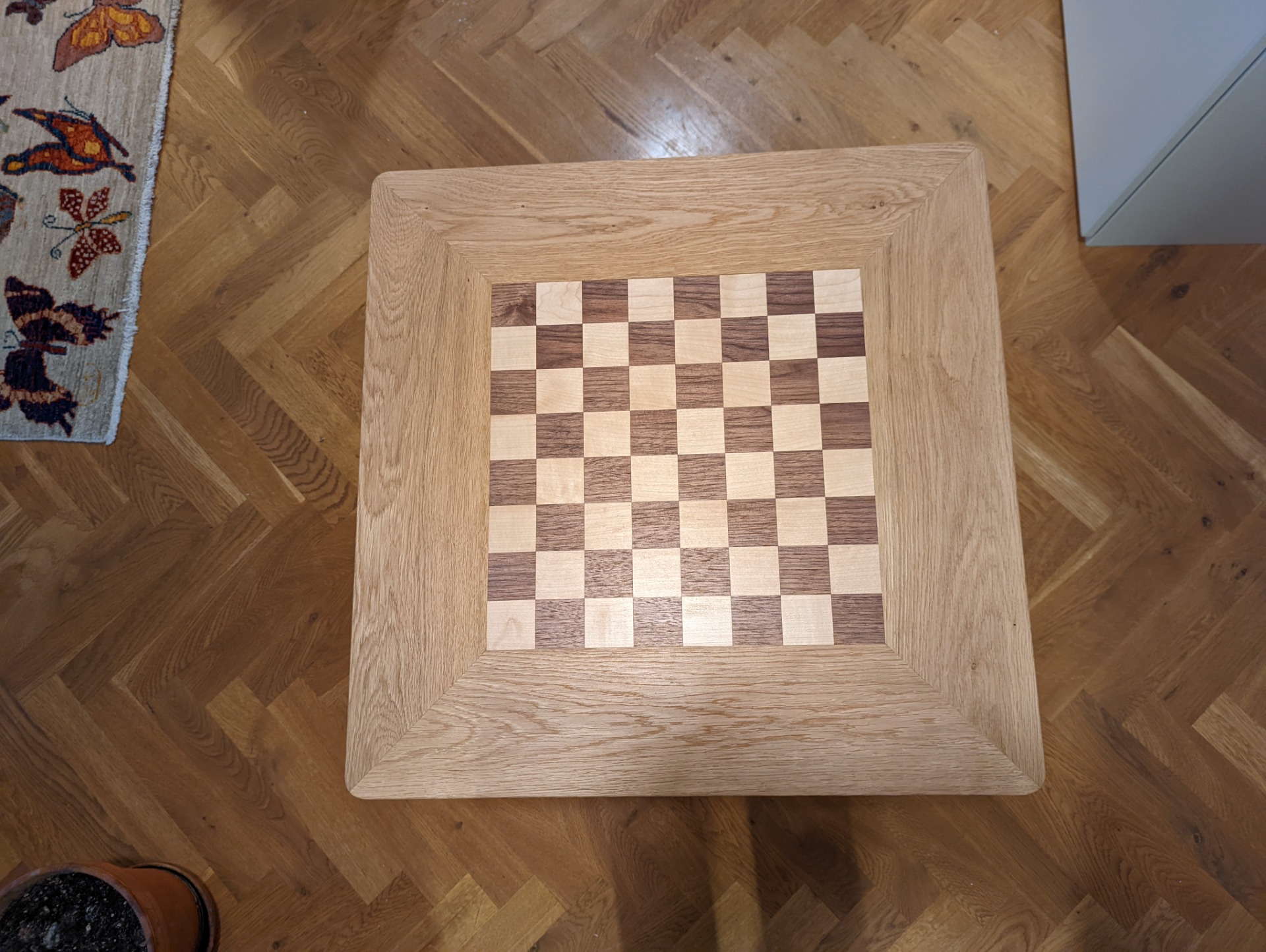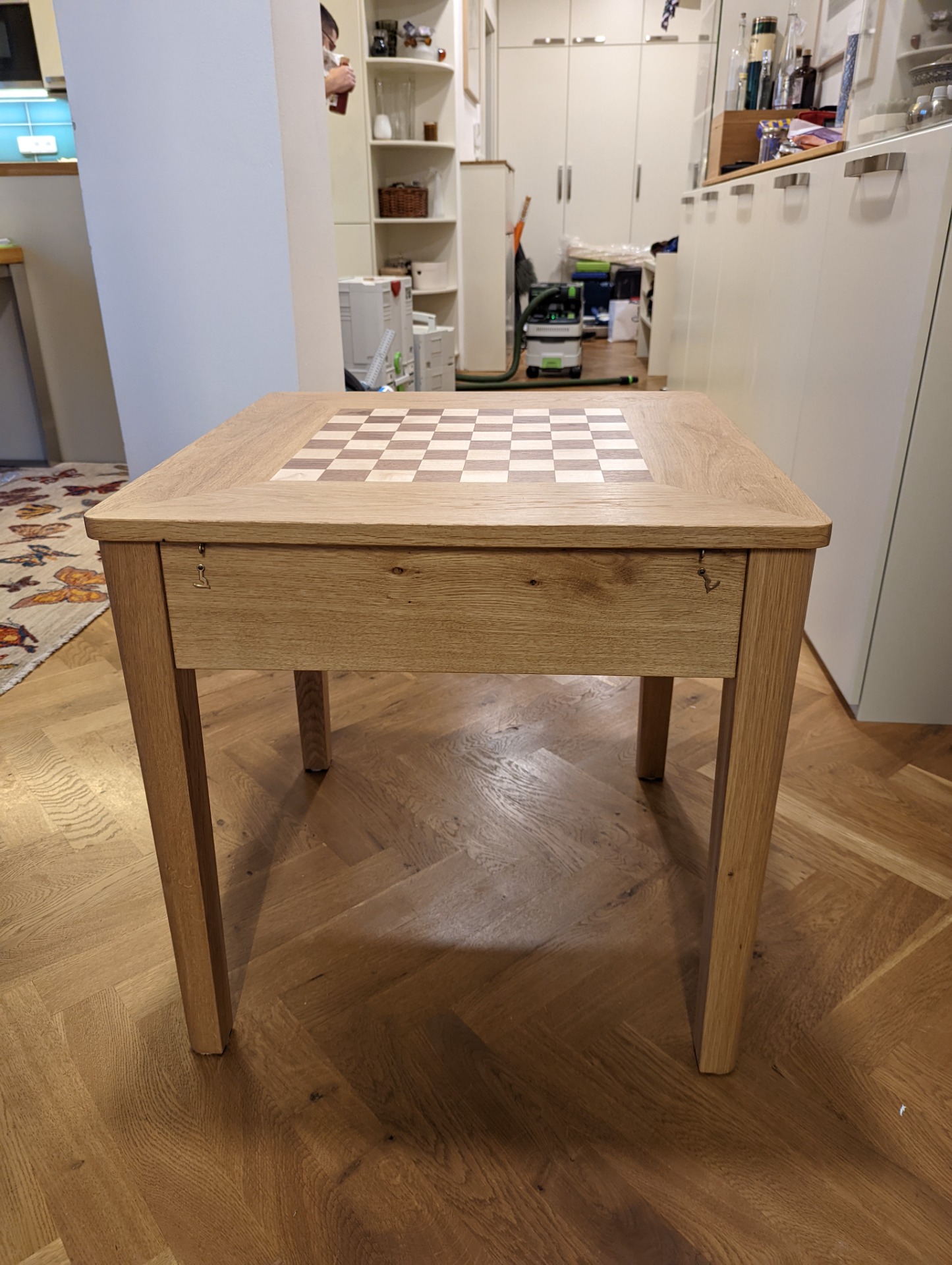 Šachový stolek je ošetřený Tvrdým voskovým olejem od firmy OSMO. Jedná se o přírodní nátěr, který si ale zachovává velkou odolnost. Při nanesení více vrstev (vždy natírám minimálně dvěma vrstvami) ho používám i na kuchyňské linky, nebo jídelní stoly. A i na těchto velmi zatížených plochách nátěr obstojí.