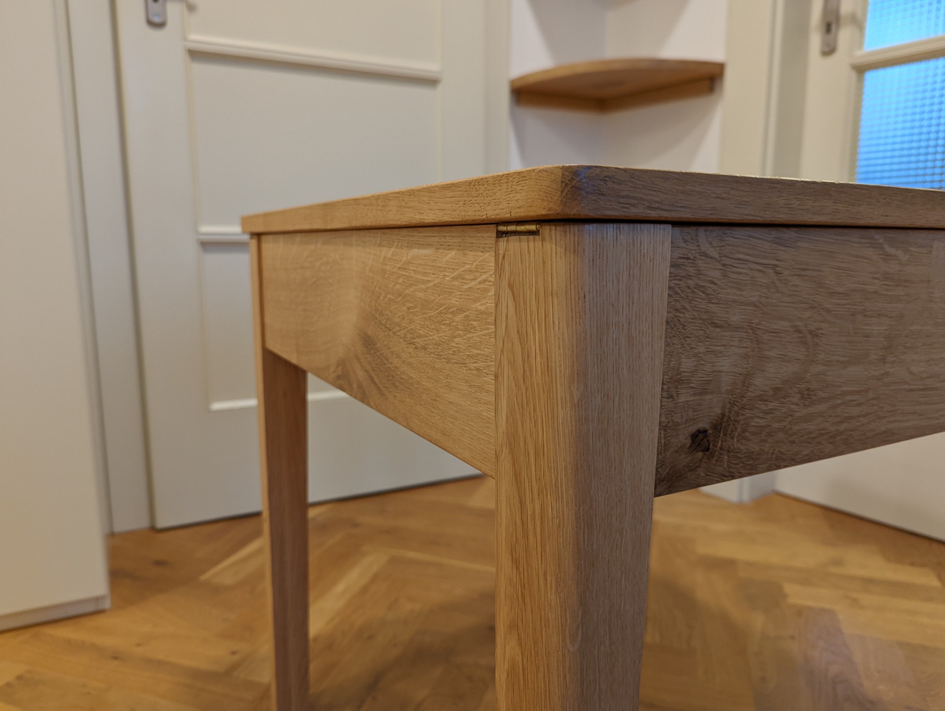 Celý stolek je vyrobený z masivního dřeva. To znamená, že všechny části jsou velmi odolné. Každý kus dřeva si sám vybírám a na dílně ho zbavím kůry, vyřežu praskliny a ohobluji. Před lepením si vždy kladu jednotlivá prkna k sobě a snažím se, aby co nejvíc ladili kresbou a odstínem a aby vynikla hezká kresba dřeva. Můžete se podívat na krátké video z mé dílny, na kterém jde vidět jak se dřevem pracuji.